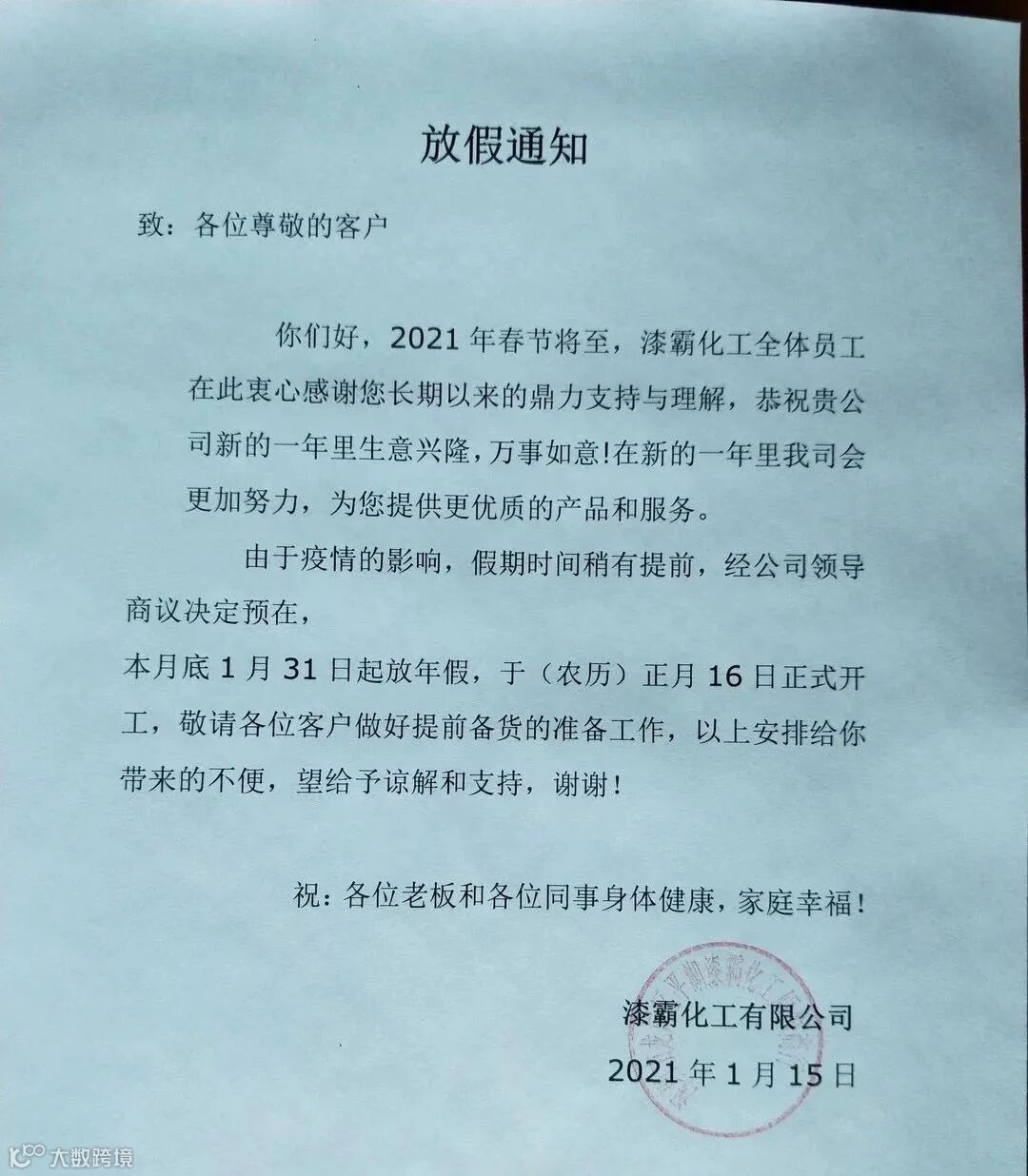 7、漆霸化工发函称,1月31日起放假,2月16日正式开工,请各位客户做好提前备货的准备工作!