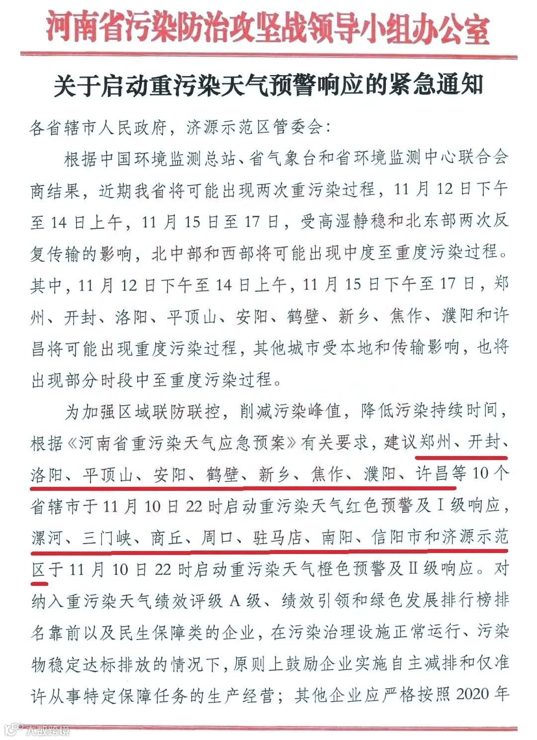 文件显示,受重污染天气预警响应影响,河南省郑州、开封、洛阳等10个省辖市启动重污染天气红色预警及Ⅰ级响应。并表示对各类污染物不能稳定达标排放或未达到排污许可管理要求的企业,在重污染天气应急响应期间采取停产或最严级别限产措施,包括玻璃钢(纤维增强塑料制品)、塑料人造革与合成革制造、橡胶制品制造行业等。