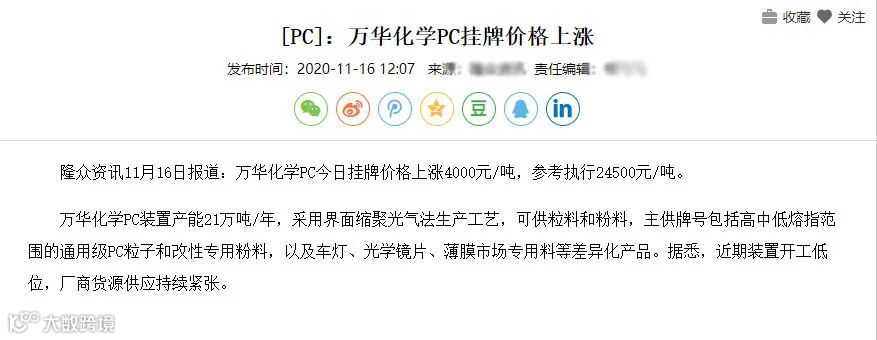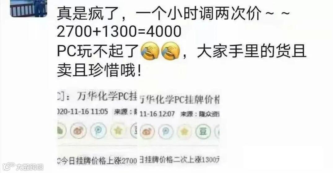 万华化学的塑料PC产品更是一小时内调价2次,上涨4000元/吨,达到24500元/吨,涨幅接近20%。