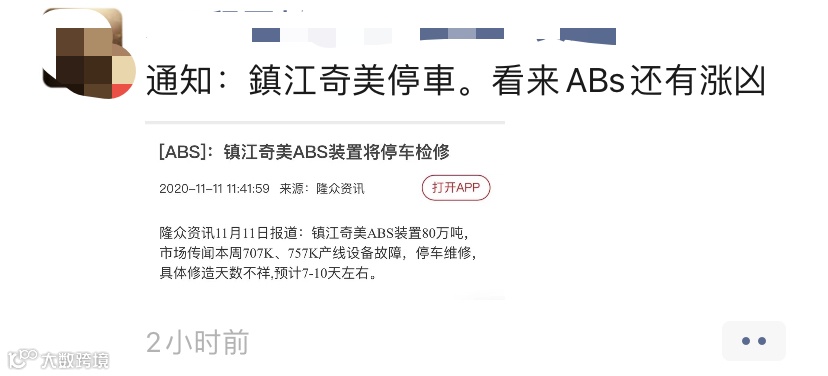ABS涨幅50.79%,镇江奇美80万生产线检修