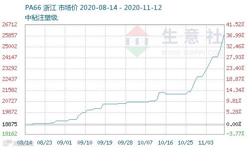 进入11月份,国内PA66市场行情延续旺季走势,各型号产品调涨幅度较大。截至11月9日,PA66参考价为24700元/吨,与11月1日的22650元/吨相比,上涨了9.05%。