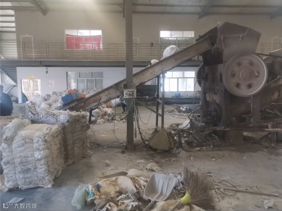 经过清点,现场查获已加工包装完成的塑料碎片20余吨,未加工的包含危险废物在内的塑料制品总共100余吨;3台切割机正在轰鸣作业。