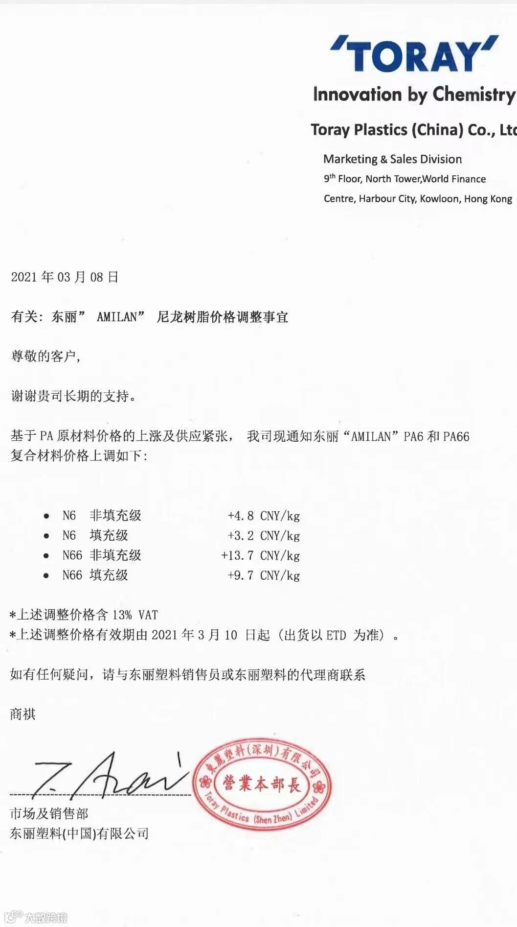 近日,东丽塑料(中国)有限公司发函通知,称由于PA原材料价格的上涨及供应紧张,上调相关产品的价格: