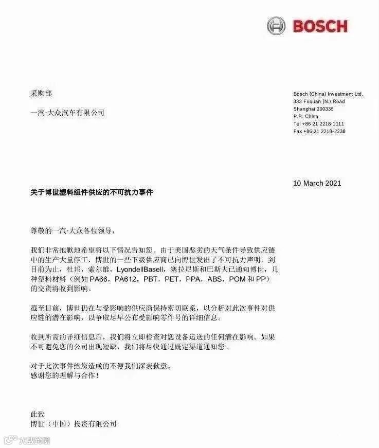 2021年3月10日,博世发布不可抗力声明