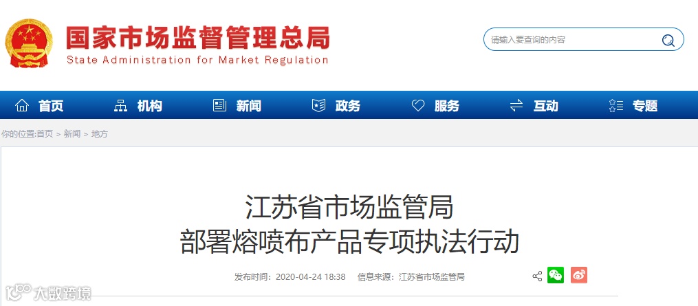 就在4月23日,江苏省市场监督管理局发布《部署熔喷布产品专项执法行动》文件,明确在全省市场监管领域部署开展熔喷布产品专项执法行动!