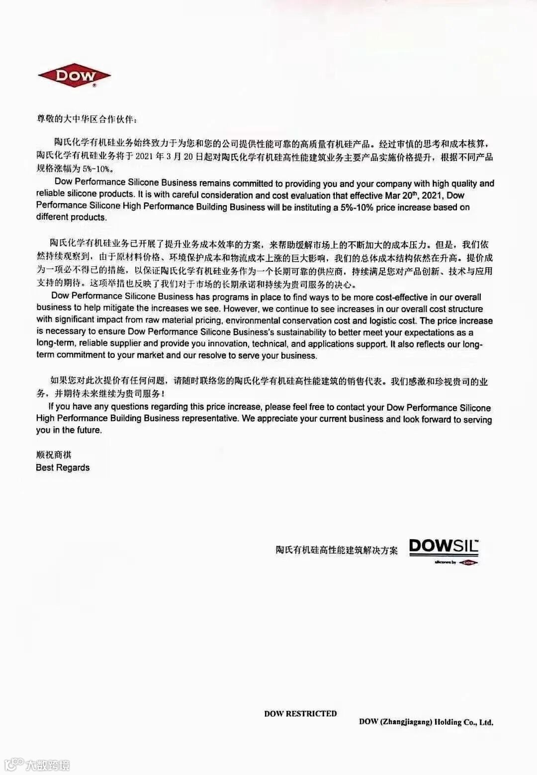 近日,陶氏有机硅业务宣布,自3月20号起将上调有机硅高性能建筑业务领域产品价格,不同产品涨幅为5%-10%,此次涨价的主要原因是近期全球原料疯涨,以及环境成本和物流成本的上涨。