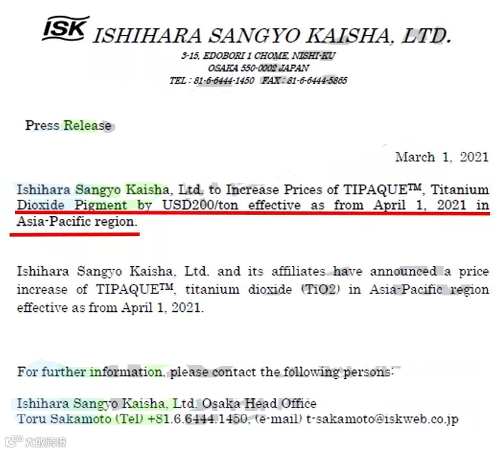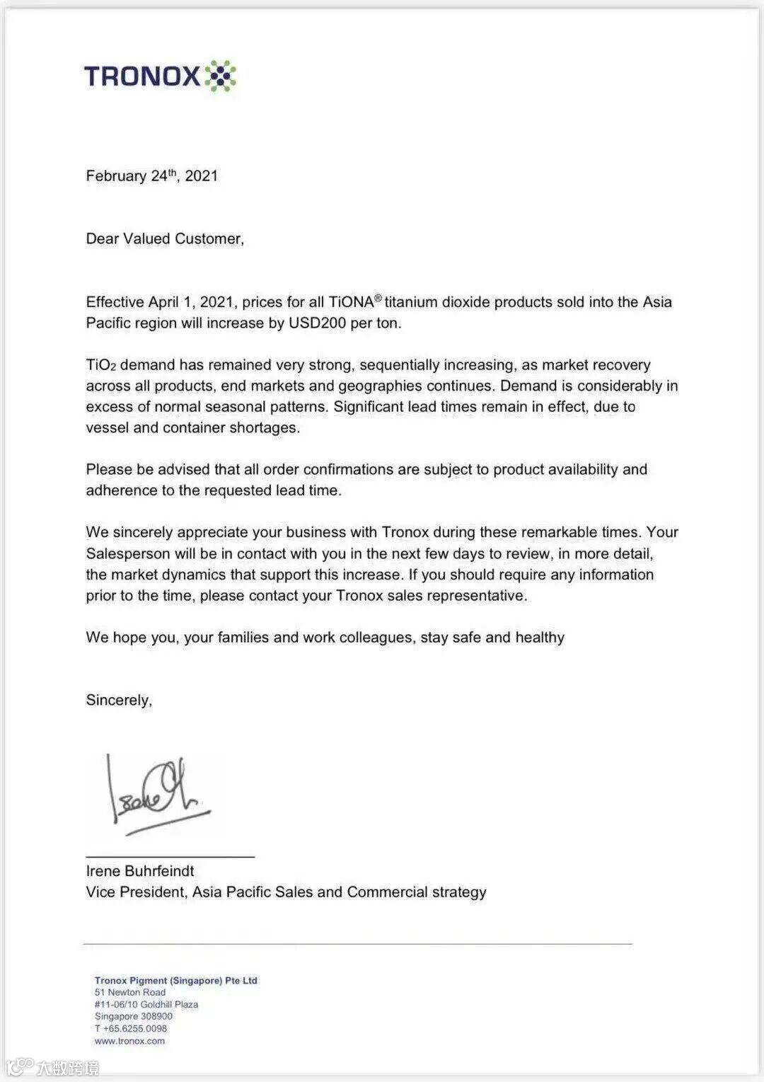 特诺:自2021年4月1日起,销往亚太地区的所有TiONA二氧化钛产品价格将每吨增加200美元(约合人民币1293元/吨。)