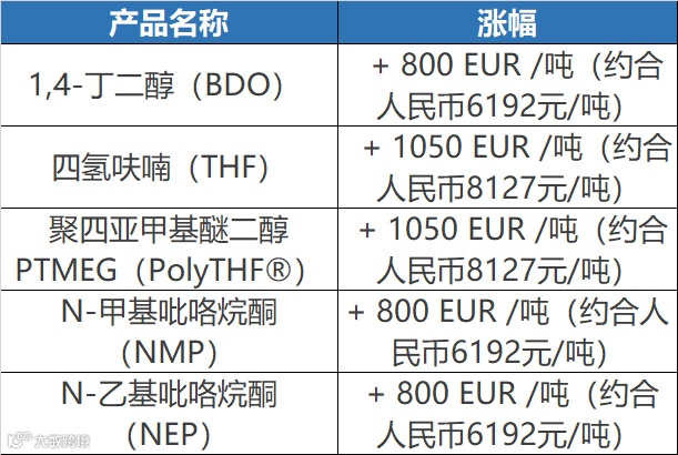 3月1日起或在现有合同允许的情况下,巴斯夫将提高其在欧洲的1,4丁二醇(BDO)及其衍生物的销售价格: