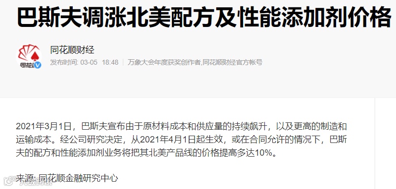 巴斯夫宣布,由于原材料成本和供应量的持续飙升,巴斯夫将在3月5日起提高亚太地区产品的价格: