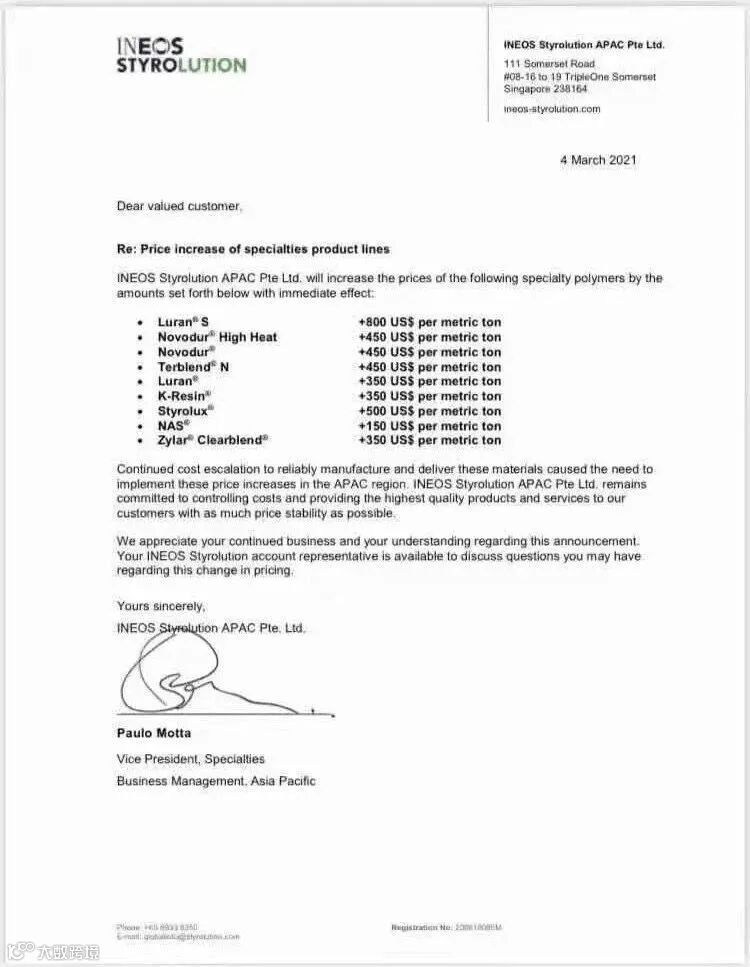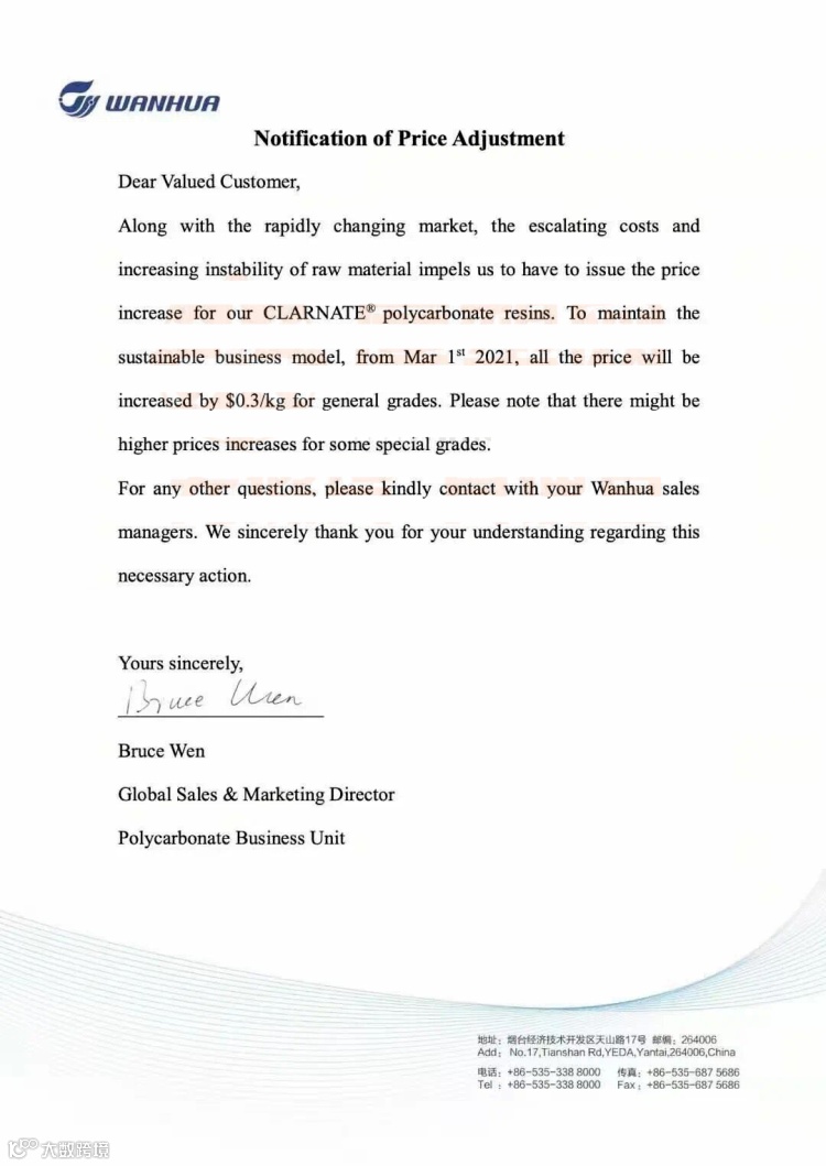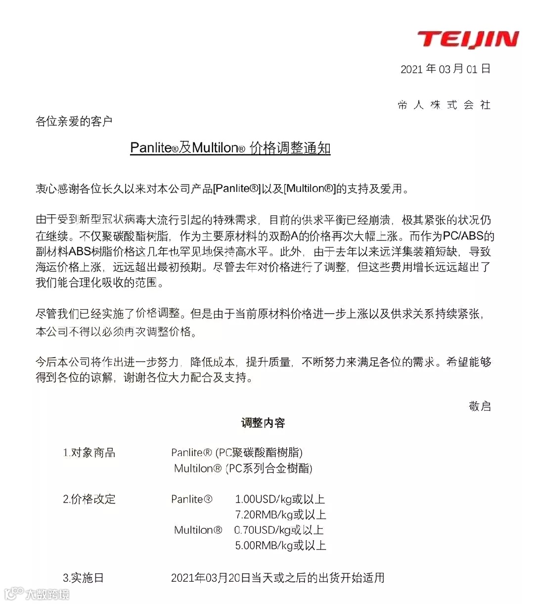 帝人株式会社发函,称因为目前供需平衡混乱,原料供应极其紧张,作为原料的聚碳酸酯树脂、双酚A等价格的大幅度上涨,以及去远洋集装箱的短缺、海运价格上涨等客观原因,不得不再次调整产品价格。