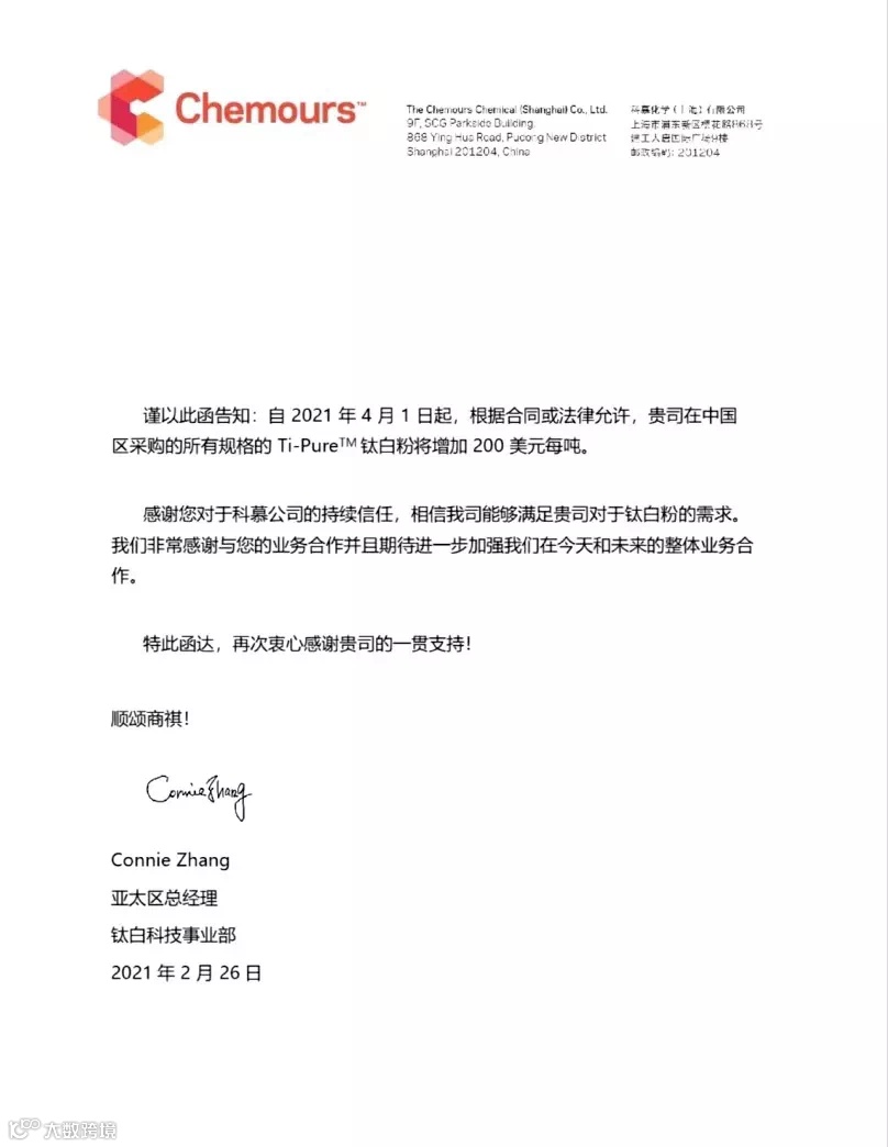 科慕:自4月1日起,中国区所有规格的钛白粉将增加200美元/吨(约合人民币1293元/吨)。