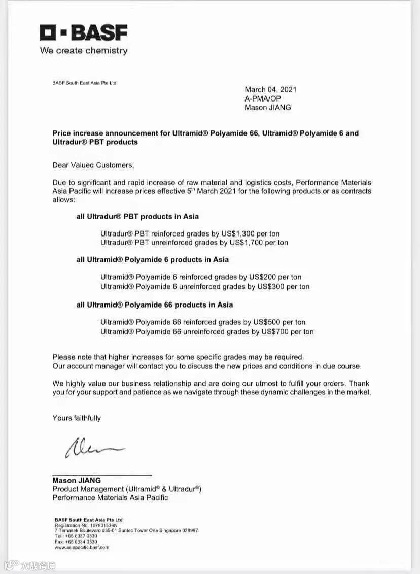未改性Ultradur® PA6 产品上涨300美元/吨(约合人民币1949元/吨)