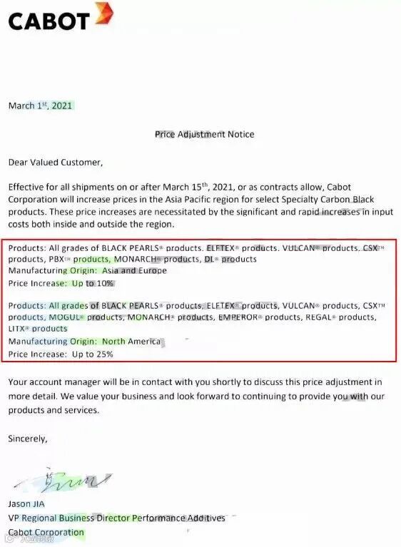 卡博特:对2021年3月15日当天或之后的所有装运有效订单,或根据合同允许,卡博特公司将提高亚太地区精选特种炭黑的价格产品。这些区域内和区域外投入成本的显著和迅速增加,使价格上涨成为必要。
