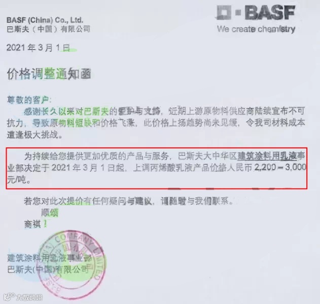 巴斯夫(中国)有限公司宣布,大中华区建筑涂料用乳液事业部决定2021年3月1日起,上调丙烯酸乳液产品价格人民币2200-3000元/吨。