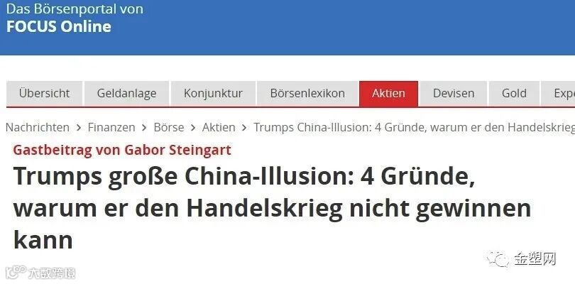 德国《焦点》周刊网站8月17日刊发知名记者加博尔·施泰因加特(Gabor Steingart)的署名文章称,美国政府在中美贸易问题上产生了巨大的错觉。美国根本无法赢得对华贸易战,原因有四:中国经济抗打击性超过美国、国际投资者并不看好特朗普政府、中国拥有14亿消费者、美国已无法逆转中国融入世界经济的现实。