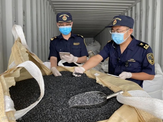 两批货物申报品名均为聚氯乙烯再生颗粒,宁波海关所属北仑海关关员在查验过程中发现,货物是利用废塑料加工而成,且形状大小不一,含有较多杂质。