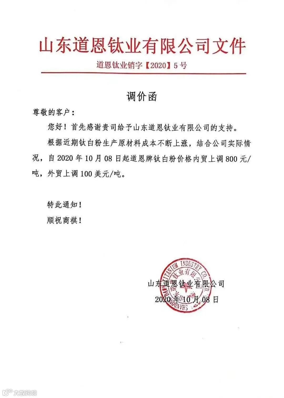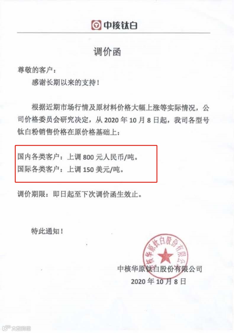 黄金周最后一天,钛白粉龙头中核钛白发布最新涨价函,宣布钛白粉再涨800元/吨,国际客户上调150美元/吨。
