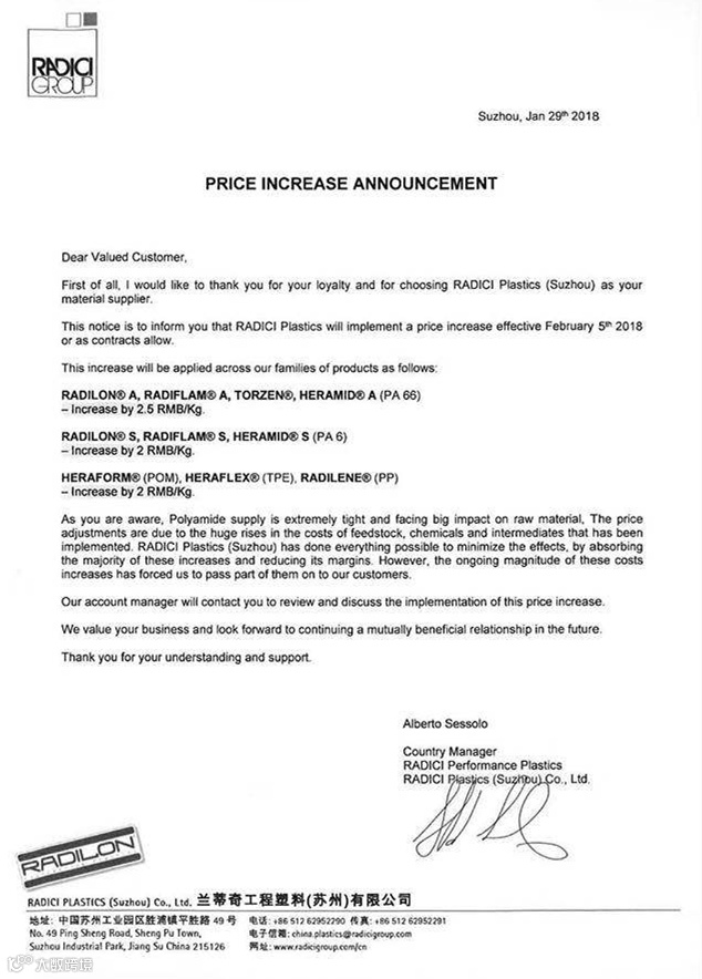 兰蒂奇宣布自2020年10月1日起,兰蒂奇PA66产品上涨2000元/吨,包含RADIFLON®A、RADIFLAM®A、TORZEN®、HERAMID®a系列。