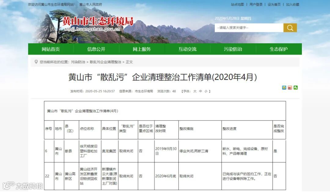 从黄山市生态环境局的网站上可以看到,在2020年4月共有22家“散乱污”企业被关闭整治,其中就有两家废塑料企业!