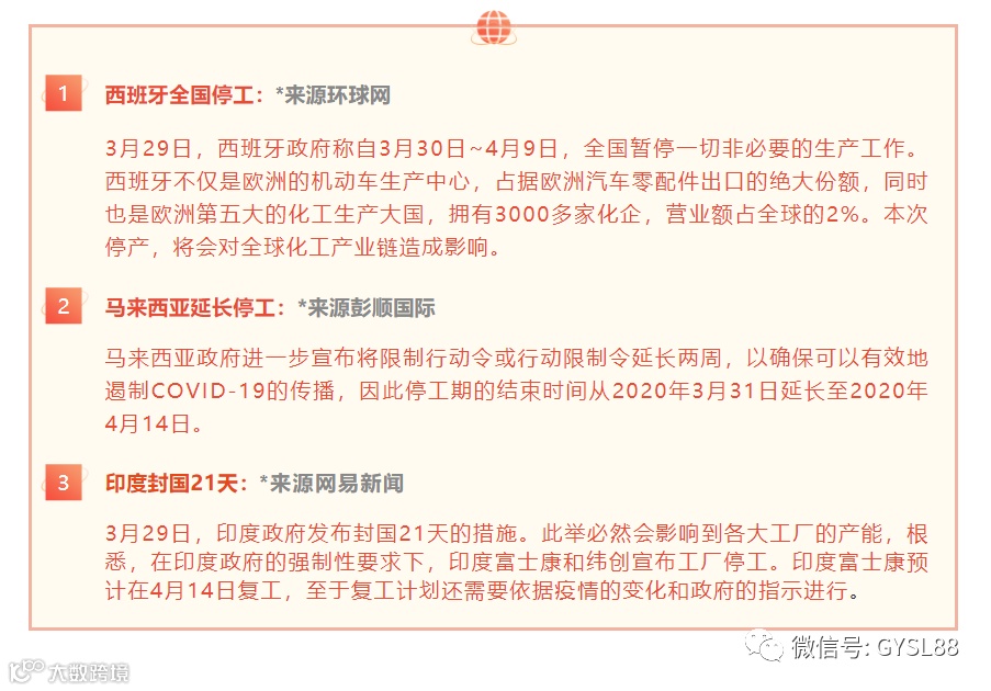 除美国外,境外也有多个国家宣布停止非必要生产,甚至延长封国时间。