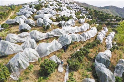 用薄膜作为重要农业生产资料被广泛使用,图为贵州省黔东南苗族侗族自治州榕江县砂糖橘种植基地,村民为砂糖橘覆盖农膜保温。
