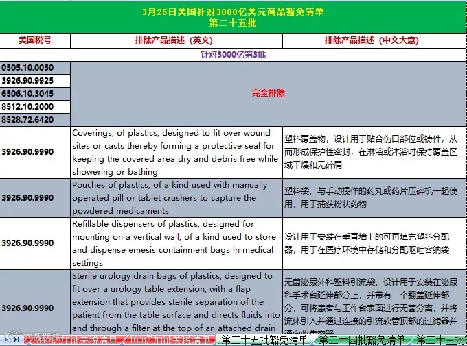 3月25日,美贸易代表办公室(USTR)公布了针对中国加征关税商品的第25批排除清单,主要涉及3000亿关税产品中5个税号下所有商品完全排除以及3个税号下7个品项商品包含医用塑料袋和医用纺织材料用品。即本次排除清单中的8个税号12个品项产品,自加征实施之日起1年内免加征7.5%的关税。