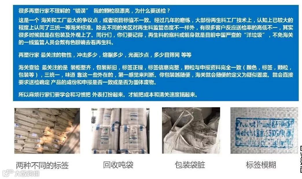 再生塑料企业看重的是材料本身的性能,而海关关注的是装柜是否整齐,包装的新旧,标签是否正规,标签信息是否完整,颗粒与申报资料是否完全一致等等。