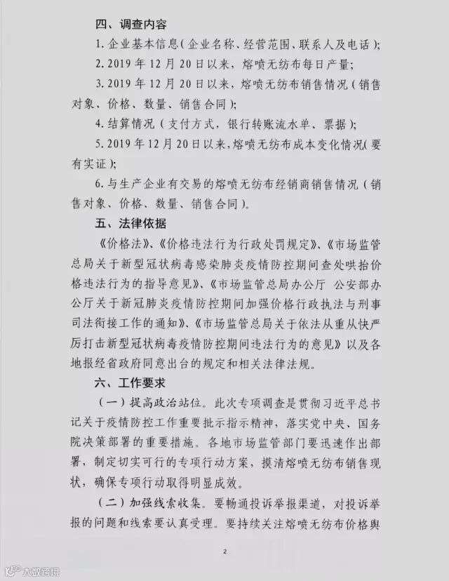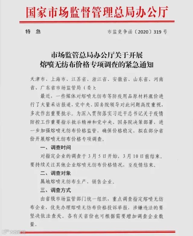 3月5日,国家“市管总”办公厅下发红头文件,针对开展熔喷布价格专项调查的特急通知,内容如下: