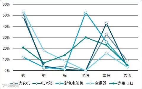 塑料在不同家用电器中所占的比重不同,在电冰箱和洗衣机中所占比例为40%左右,在电视机中约占23%,在空调器中约占11%。家用电器中含有的塑料种类很多,主要为热塑性塑料,PP、PS、PC、ABS、PVC 等最为常见,同时也含有部分热固性塑料,如PU。