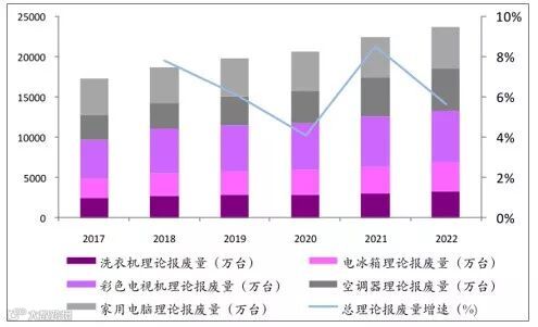 预计到2022年,四机一脑理论报废量总计2.37亿台,其中电视理论报废量0.64亿台,冰箱0.36亿台,洗衣机0.33亿台,空调0.53亿台,电脑0.51亿台。
