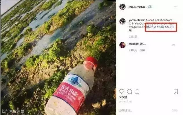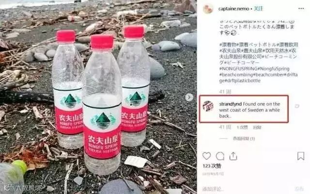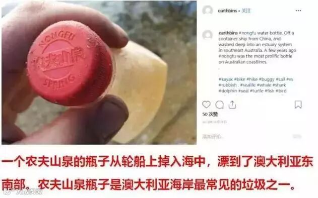 Instagram上一名叫earthbins,专门拍摄和捡拾澳大利亚海滩上的垃圾。在他的帖子里,农夫山泉不仅是最常出现的瓶子,而且是最常出现的品牌。海滩垃圾的江湖谱上,比起农夫山泉,连可口可乐都只能屈居第二。