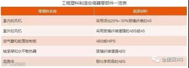 空调一般分为室内机和室外机两部分。室内机所用塑料占到总重量的30%以上,其中使用最广泛的是ABS和HIPS。空气过滤器是由PP纤维在PP支架上围织,排水管用软质PVC挤出。室外机壳体已经逐渐采用塑料代替钢板,其中进气窗和控制板采用HIPS制备,贯流风机部件采用玻纤增强ABS,室外机壳体目前采用耐候PP制备。