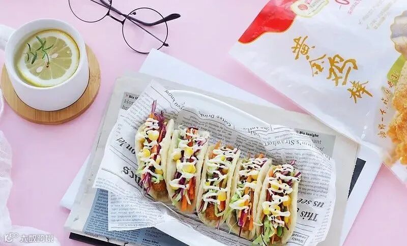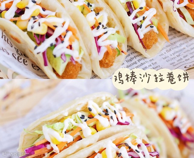 12. 取一张饼皮,放入黄瓜和鸡棒,挤上沙拉酱。