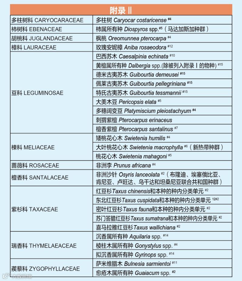 1、所有黄檀属树种(约300种左右)列入附录Ⅱ。