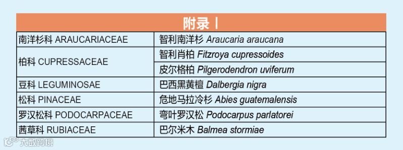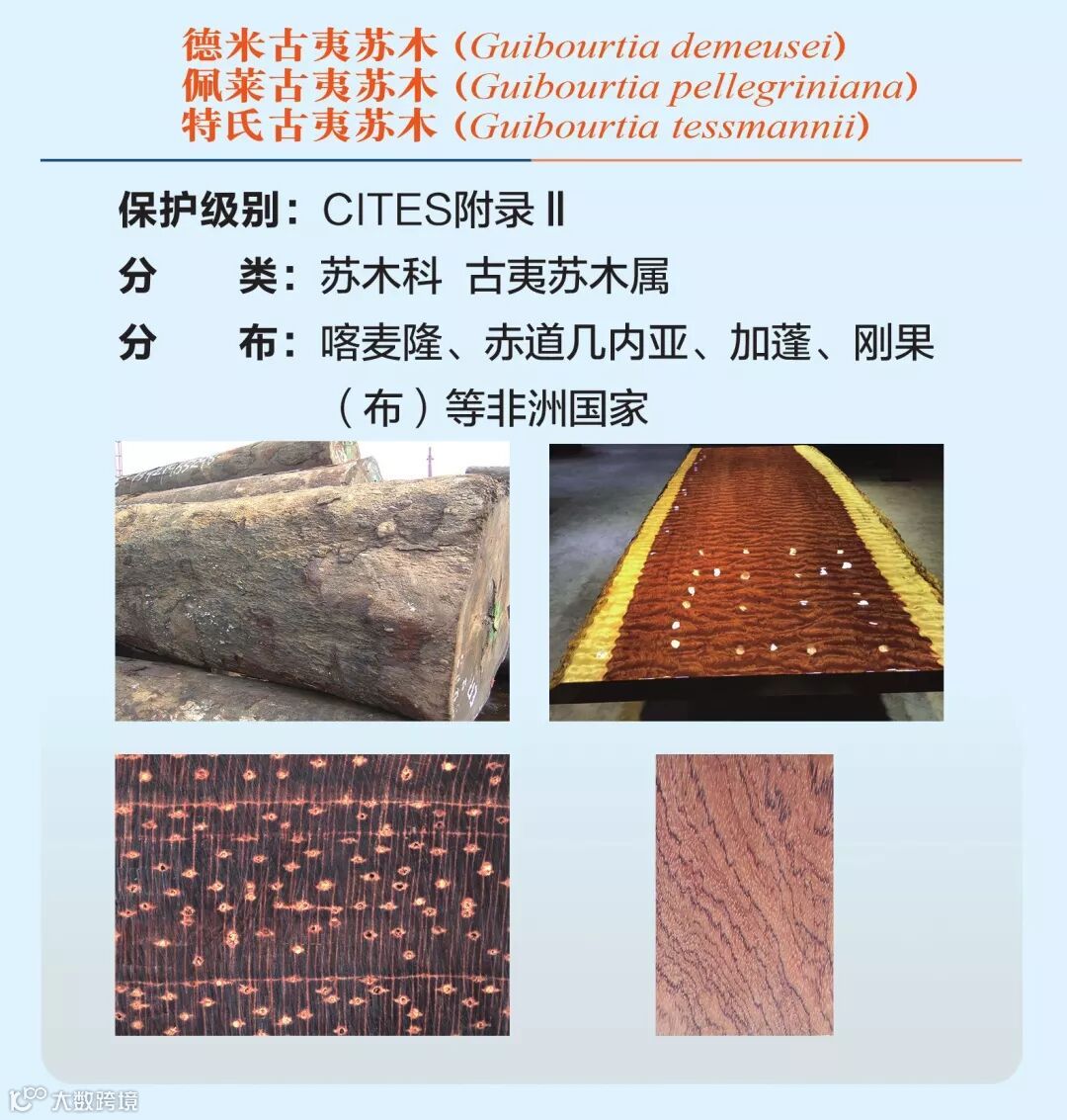 2、三种古夷苏木(德米古夷苏木、佩莱古夷苏木、特氏古夷苏木,俗称:大巴花)列入附录Ⅱ。