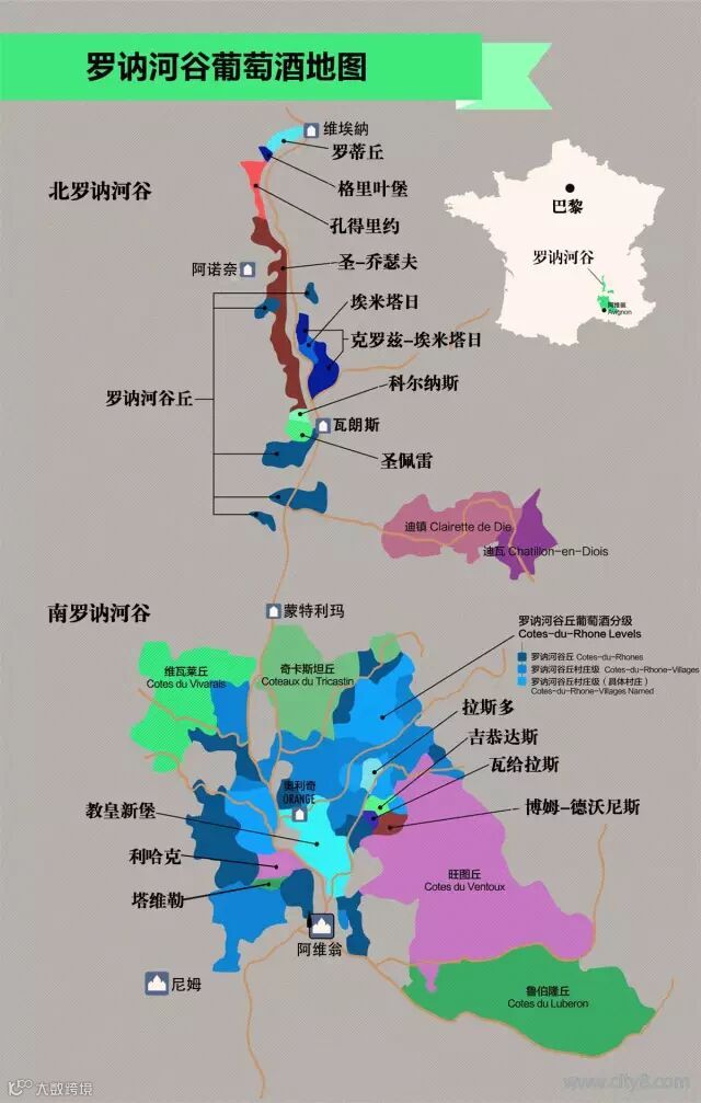 提及历史悠久的罗讷河谷(Rhone Valley)产区,有人会想起歌海娜(Grenache)、西拉(Syrah)和慕合怀特(Mourvedre)混酿的“GSM”葡萄酒,有人会想起用十三种葡萄混酿的教皇新堡葡萄酒,有人会想起大肚浮雕瓶。罗讷河谷是继法国波尔多(Bordeaux)和勃艮第(Bourgogne)之后最有名的红葡萄酒圣地,从南到北跨度较大,气候条件也有所差距,从而造就了很多知名产区,如红葡萄酒圣地罗蒂丘(Cote-Rotie),白葡萄酒圣地格里叶堡(Chateau Grillet),桃红圣地塔维勒(Tavel),起泡酒产地圣佩雷(Saint-Peray)和甜酒产地博姆-德沃尼斯(Beaumes de Venise),今天就来盘点 15 个罗讷河谷最有名的村庄。