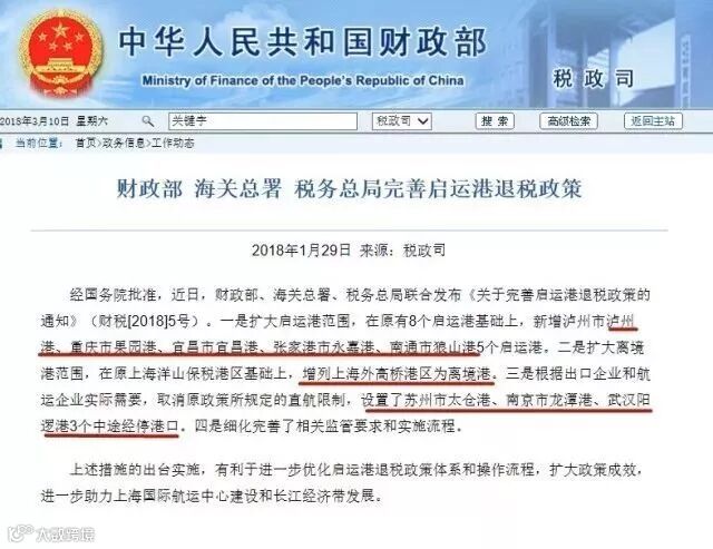 财政部于1月29日发布消息称,我国为进一步完善启运港退税政策,将新增泸州港、南通狼山港、张家港市永嘉港等5个启运港、增列1个离境港,并设置苏州市太仓港、南京市龙潭港、武汉阳逻港3个中途经停港口,根据出口企业和航运企业实际需要,取消原政策所规定的直航限制。