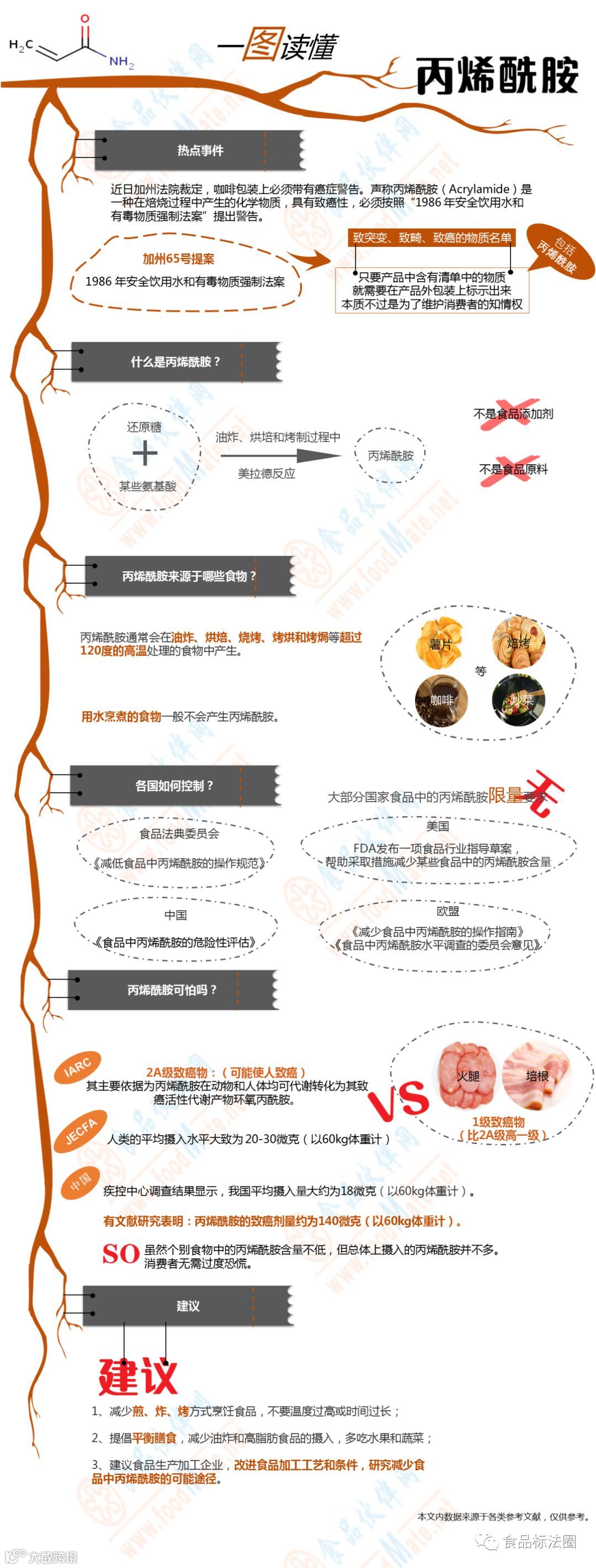 近日加州法院裁定,咖啡包装上必须带有癌症警告。声称丙烯酰胺(Acrylamide)是一种在焙烧过程中产生的化学物质,具有致癌性,必须按照“1986 年安全饮用水和有毒物质强制法案”提出警告。食品伙伴网标法中心制作了长图文,带你了解丙烯酰胺。