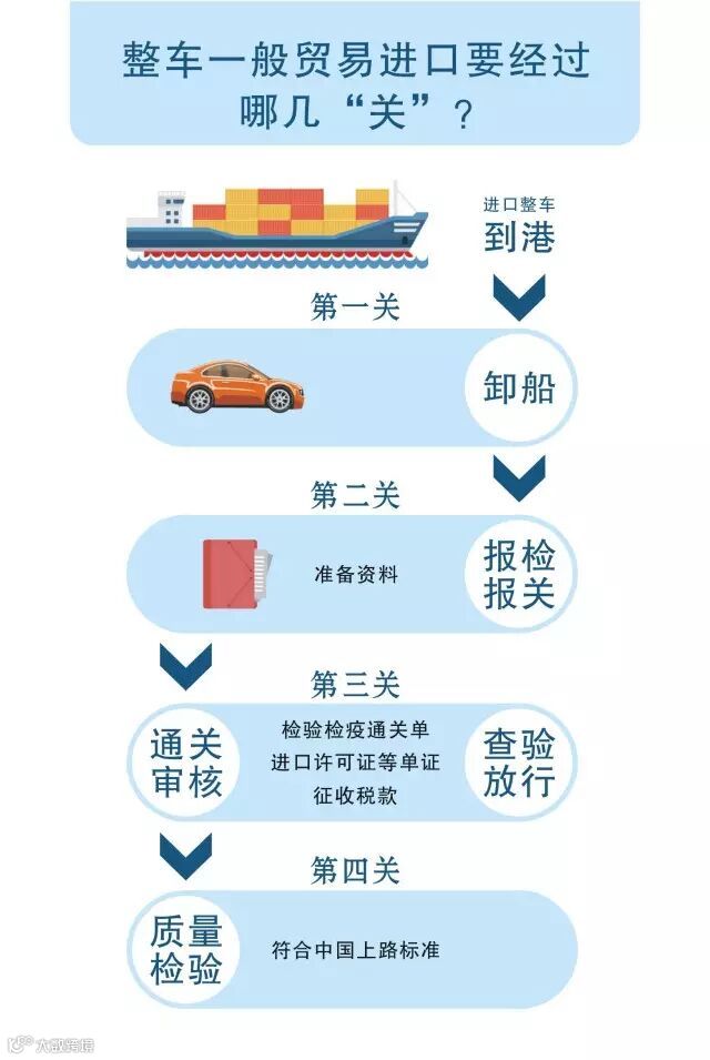进口整车到港后,第一关是卸船,第二关是准备资料报检、报关,第三关是通关审核,包括审核检验检疫通关单、进口许可证等单证,征收税款以及查验放行,第四关是质量检验,确保进口整车符合中国上路标准。