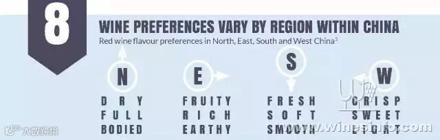 在中国东部、西部、南部和北部,对红葡萄酒的风味偏好也不一样。