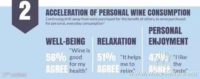 调查显示,有56%的人群是出于健康原因选择葡萄酒,51%认为葡萄酒让他们感到放松,47%为获得愉悦的感受。