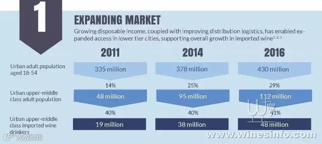 2016年年龄段在18到54岁的城市人口数量为4.3亿,其中中产阶级及以上人群占29%,为1.12亿。这个人群中,有41%都是进口葡萄酒的消费者,为4800万。