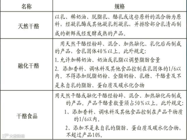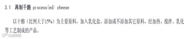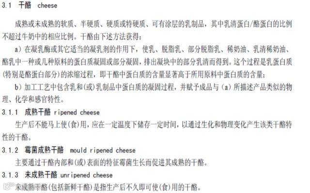 其中国际粮农组织(FAO)关于干酪的定义为“通过将牛乳、脱脂乳或部分脱脂乳、或以上乳的混合物凝结后排放出液体而得到的新鲜或成熟产品”。