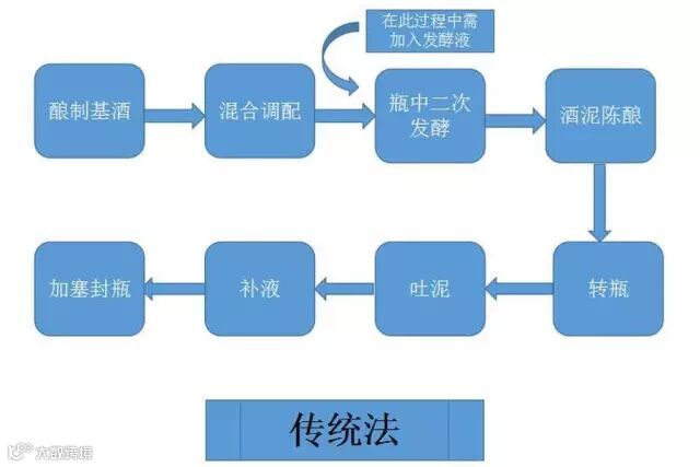 ② 瓶中二次发酵(Second Alcoholic Fermentation)。将调配好的基酒装瓶,并加入发酵液,发酵液是由静止葡萄酒、糖、酵母、酵母营养物质和澄清剂组成的液体。盖上瓶盖,即可以在瓶中进行第二次发酵,产生二氧化碳气体。