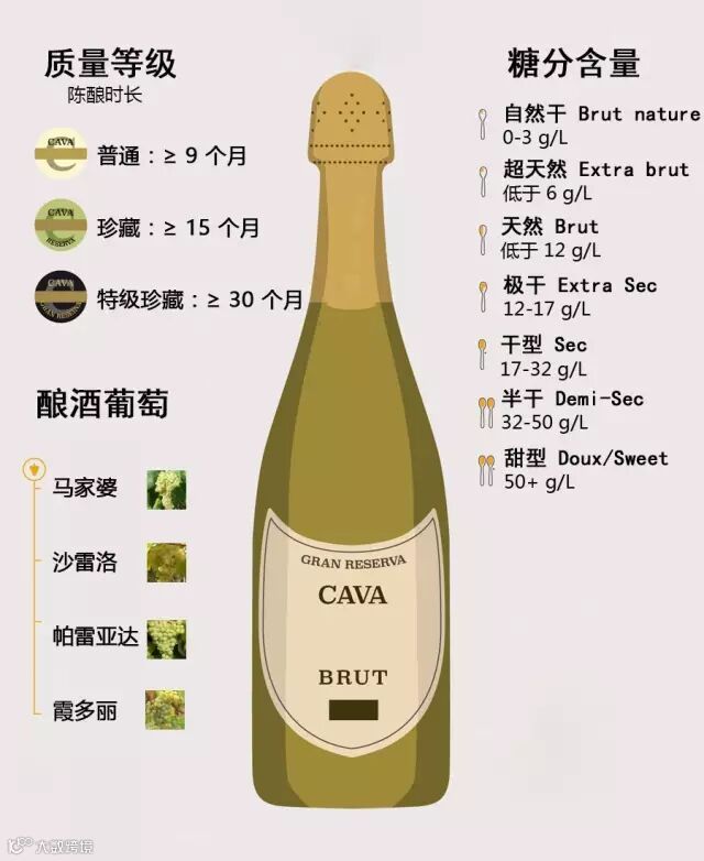 ① 普通卡瓦(Cava):普通卡瓦属于最低级别,这种酒必须要经过 9 个月酒泥陈酿。
