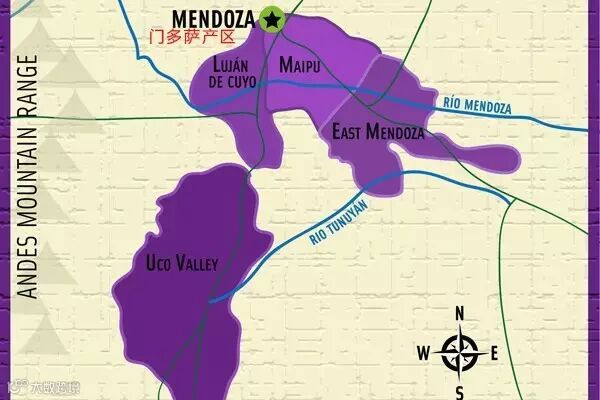 (2)迈普(Maipu):位于门多萨省的北面,土壤为少见的砾石地,以出产优质的赤霞珠葡萄酒著称。迈普是阿根廷历史最悠久的产区之一,拥有非常理想的葡萄种植条件,出产的赤霞珠和马尔贝克葡萄酒,单宁强劲,酒体平衡细腻,层次复杂,是阿根廷葡萄酒的骄傲。