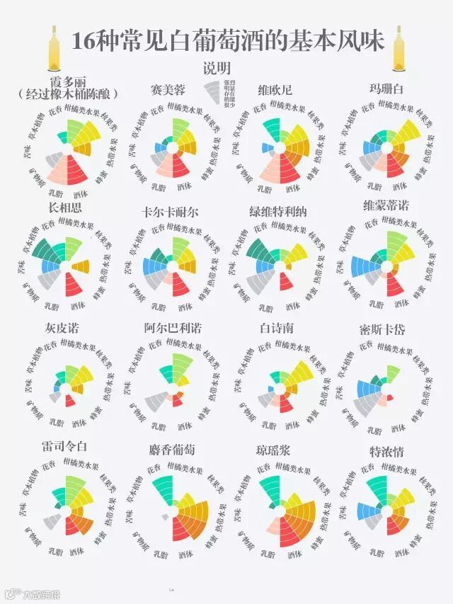 下面的表格罗列了 16 种常见白葡萄酒和它们基本的风味。