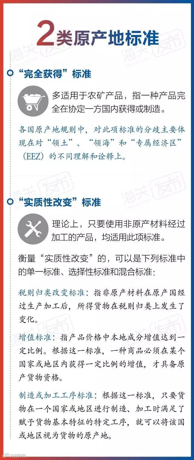 原产地标准是指在原产地规则中规定的,用以判定货物原产地的依据。无论是优惠原产地规则还是非优惠原产地规则,目前世界各国在具体产品的原产地标准上存在很大差异,但大致可分为两类: