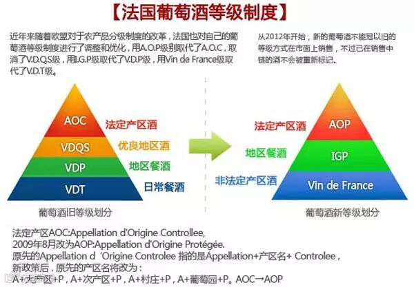 为了配合欧洲农产品级别标注形式,法国葡萄酒的分级体系在 2009 年发生了一次改革: