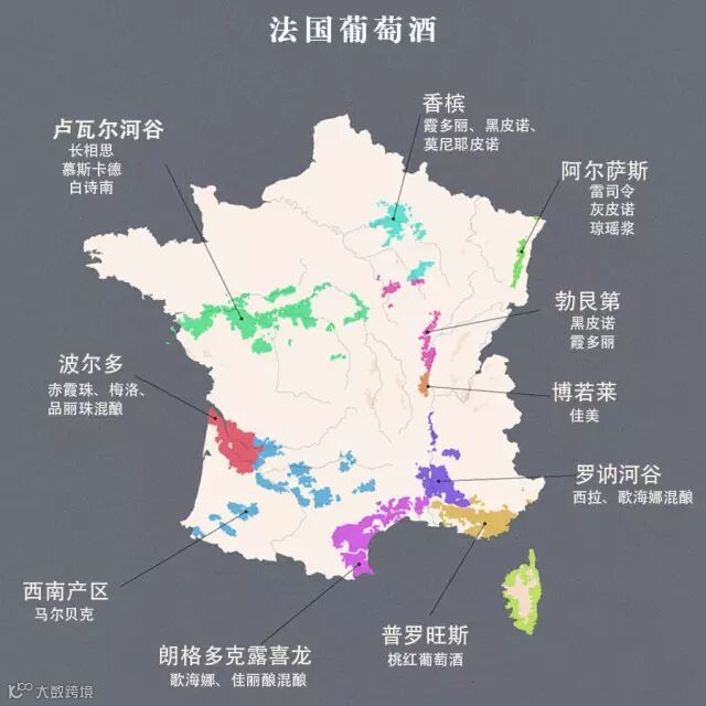 为方便大家更好地读懂酒标,以下奉上法国 10 大产区的主要葡萄酒类型,记下来,下次看到哪个产区的酒就能轻松判定葡萄品种了。